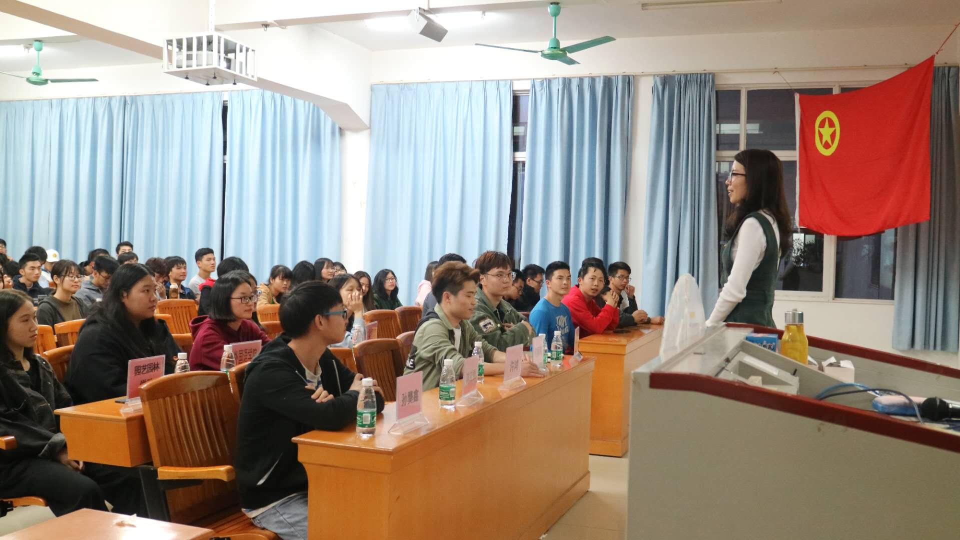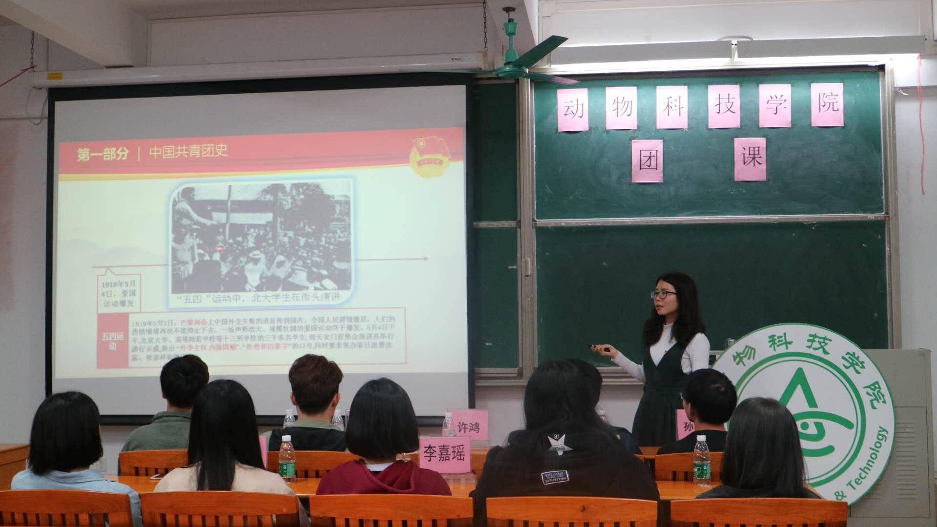 本次团课在高昂的团歌声中正式开始。团委副书记许鸿就中国共青团史、共青团团员义务和权利、 辉煌十九大,乡村振兴战略及勇于担当,做时代青年四方面展开。1957年,中国新民主主义青年团正式改为中国共产主义青年团。共青团是党的助手和后备军,并详细介绍中国共产党发展党员的流程及中国共青团团员的义务和权利。许鸿老师结合今年会校训,对十九大中的意义、主题、八个明确以及未来战略分别进行讲解,并结合今年会校长骆少明的话,认为动科院学子在未来会有更广阔的平台。她认为每个团员都应该成为一个能遵守团章以及校纪校规,勤奋学习,能起模范带头作用的有思想、有道德、有文化、有纪律的四有青年。
