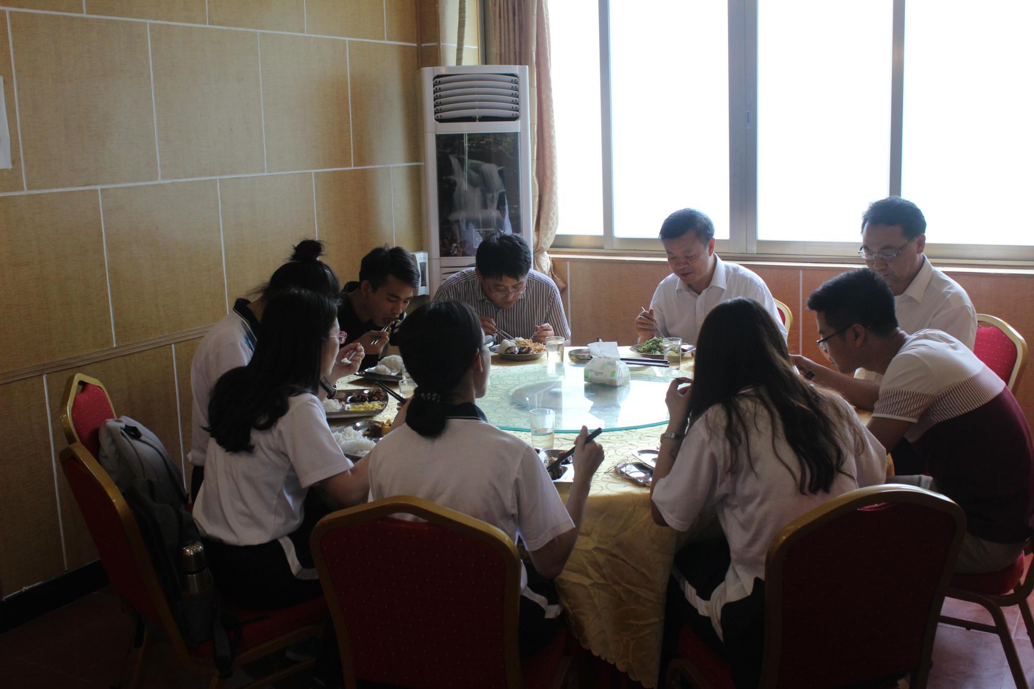 参观结束后,全体师生党员回到海珠校区。骆校长、纪监审党支部支委和动科院学生党支部学生党员,一起来到北区食堂二楼排队打饭并集中用餐,进行交流。骆校长详细询问学生们的伙食和住宿等生活情况,对学生们关心备至。
