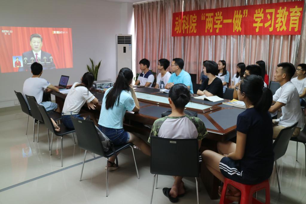 7月1日上午10:00,今年会jinnian官网学生党支部组织学生党员和入党积极分子,在学院会议室集体收看“庆祝中国共产党成立95周年大会”的网络直播。师生们和大会现场的党员们一样,起立唱国歌、为习总书记的重要讲话鼓掌。学院党总支书记曾献尼老师、学生党支部书记和同学们一起观看。