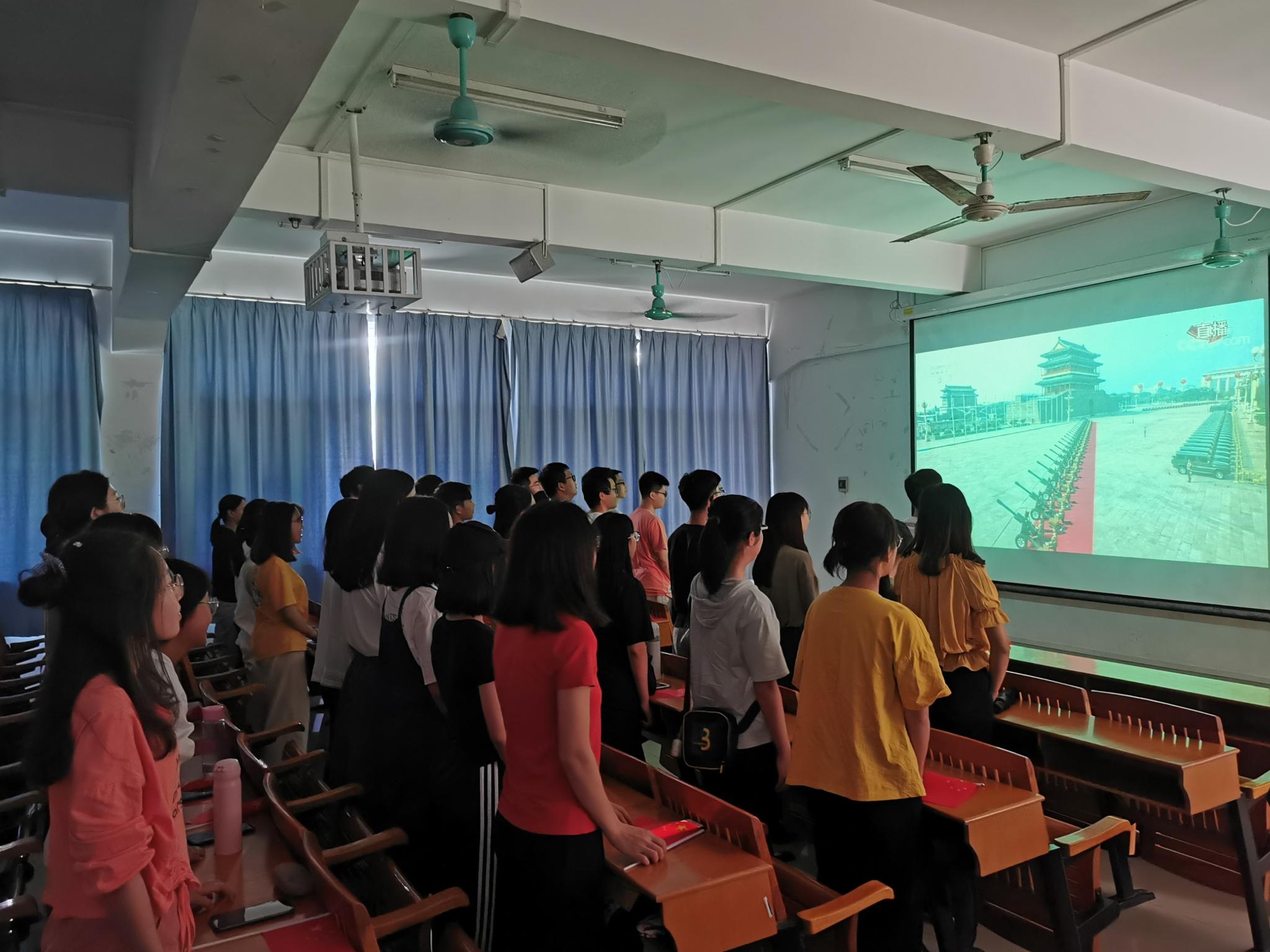 上午九时,学生已早早来到了直播会场。十点钟,56门礼炮72声响彻云霄,一声声巨响让人震撼。在庄严的国歌前奏中,同学们全体起立,注视着国旗冉冉升起,齐唱国歌,深深的自豪感油然而生。全场师生聚精会神聆听习近平总书记重要讲话,纷纷被习近平主席的发言深深感动。