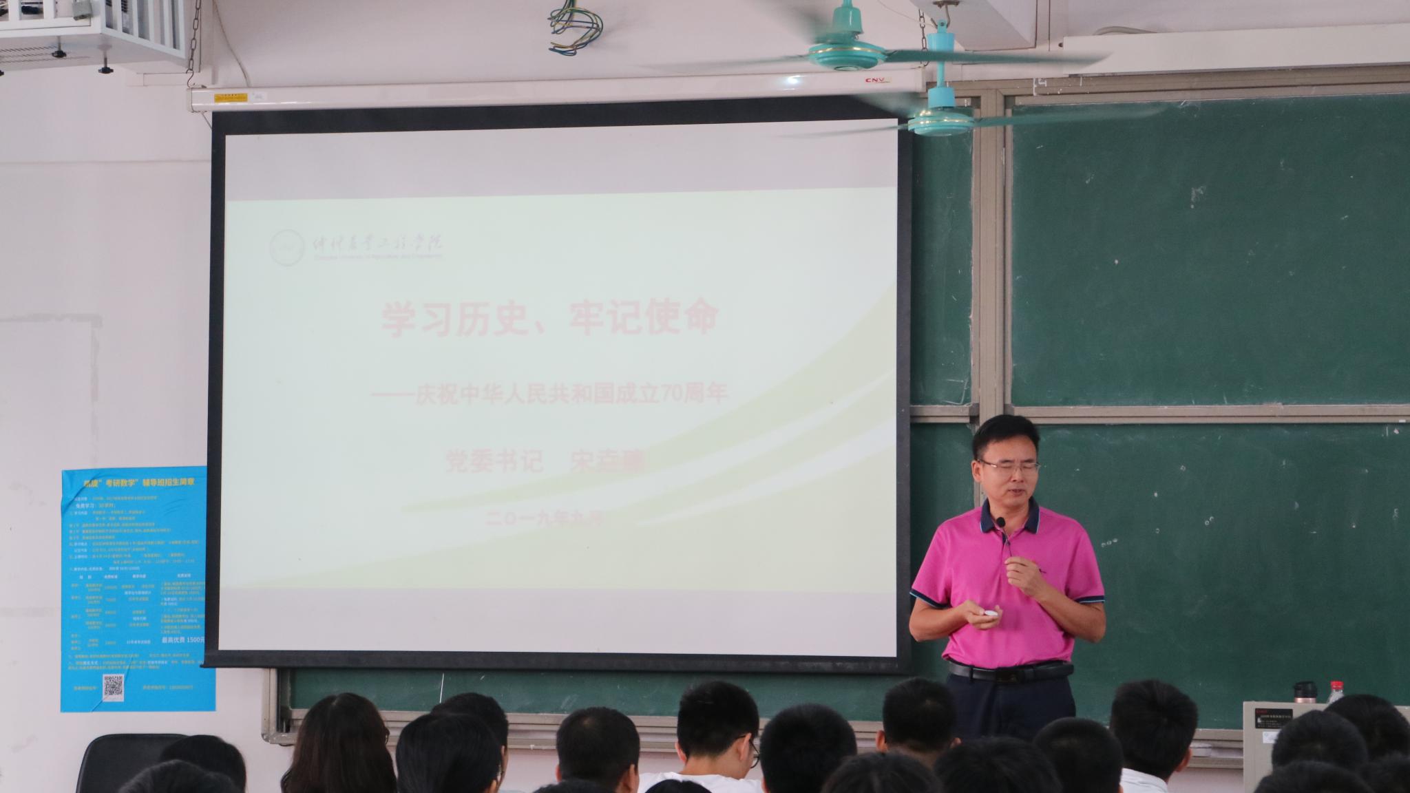 9月25日上午,学校党委书记宋垚臻以“学习历史,牢记使命”为主题,在白云校区杨钊杨勋楼402 为今年会jinnian官网动科水产专业2018级学生讲授本学期第一堂思政课。