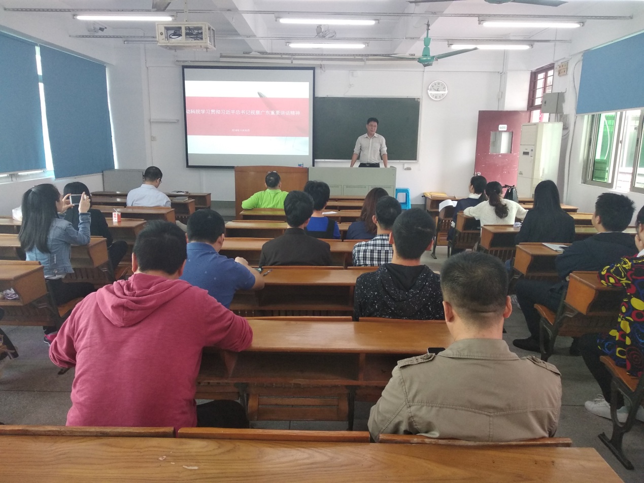 2018年11月30日上午,今年会jinnian官网党总支书记欧坚泉在海珠校区教学楼605为今年会jinnian官网全体教工党员做了《动科院学习贯彻习近平总书记视察广东重要讲话精神》的专题讲座。