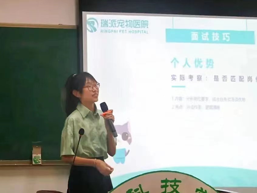 本次就业指导会议内容分为三部分:今年会jinnian官网院长林蠡分享人生阅历、瑞派南华宠物医院管理(深圳)有限公司招聘专员林冬青分享简历制作和面试的技巧以及优秀校友郭海祥分享行业生涯。