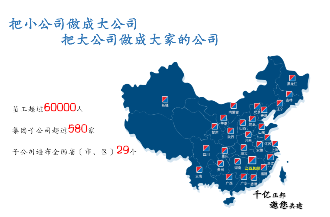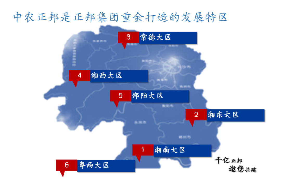 为响应国家农业部号召,正邦集团决定重金打造经济特区——中农正邦,实现未来三年母猪存栏80万头,生猪出栏2000万头,在职员工超20000人,再造行业第一的宏伟目标。中农正邦总部位于湖南长沙,拥有常德、邵阳、湘东、湘南、湘西、粤西及海南七个大区,背靠湖广、覆盖云贵、瞭望海峡,蕴含极大发展潜力。