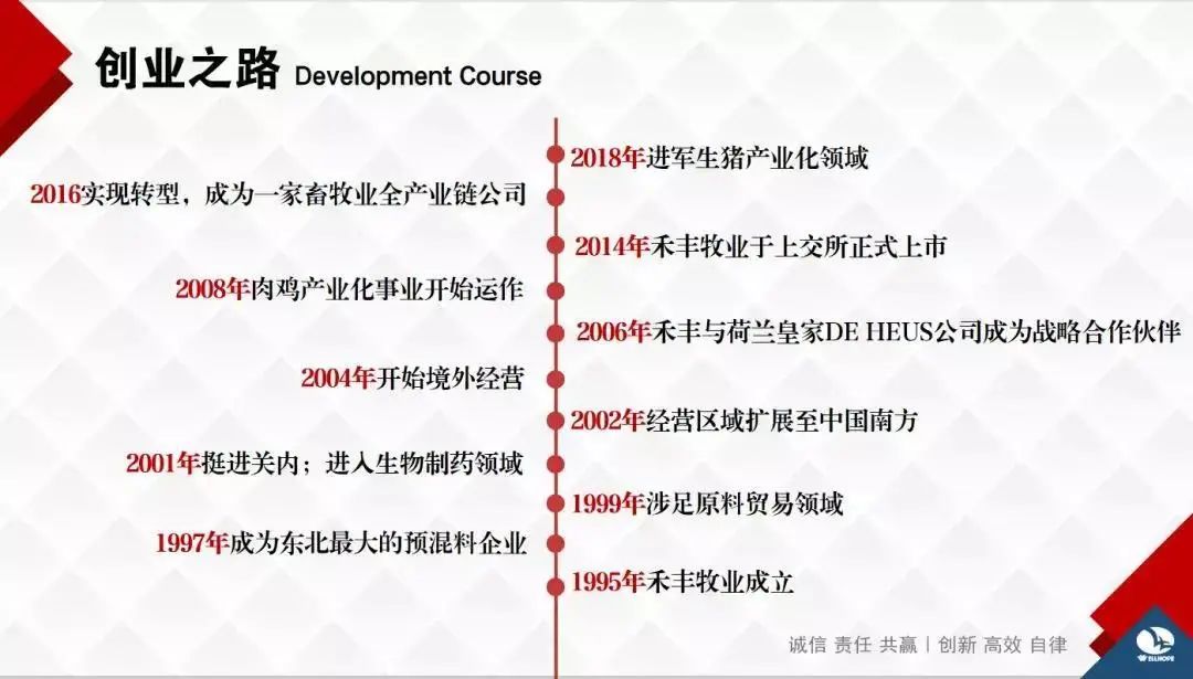 辽宁禾丰牧业有限公司创立于1995年4月,公司拥有饲料与生猪养殖、肉禽产业化、原料贸易三大核心业务,同时涉猎动物药品、养殖设备、国际事业、宠物医疗及食品加工等相关领域。