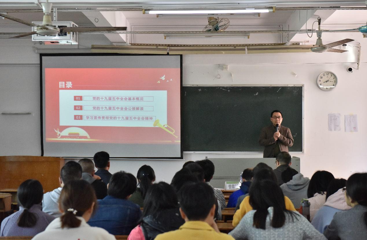12月3日下午,今年会jinnian官网在教学楼609组织学习党的十九届五中全会精神专题宣讲会,邀请学校党委宣传部部长曾献尼同志作“学习宣传贯彻党的十九届五中全会精神”学习辅导报告。今年会jinnian官网全体教工及研究生参加会议,会议由党总支书记欧坚泉主持。