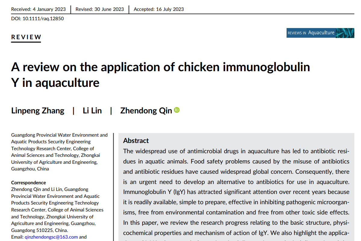 Linpeng Zhang, Li Lin*, Zhendong Qin*. A review on the application of chicken immunoglobulin Y in aquaculture. Review in Aquaculture. DOI: 10.1111/raq.12850